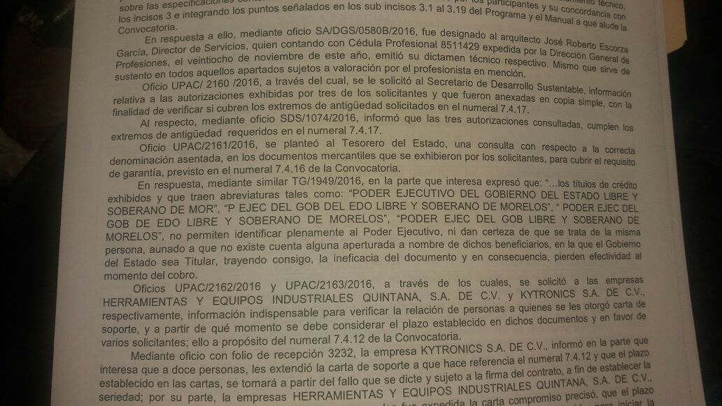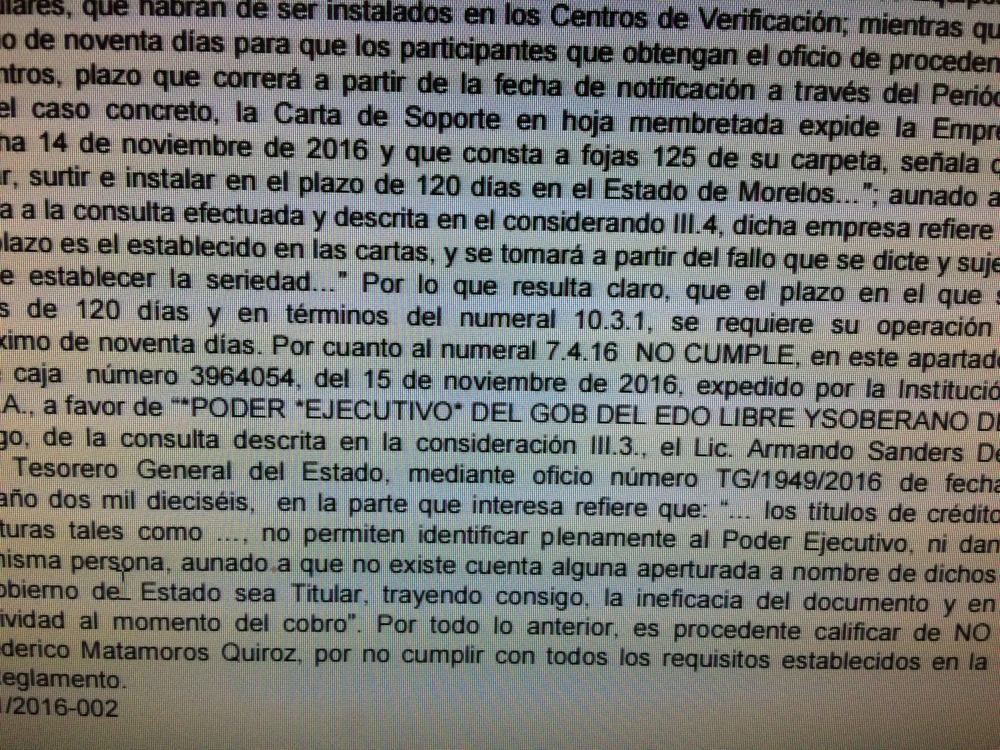 Es importante recodar que la primera violación que hubo en la licitación fue que la Unidad de Procesos para la Adjudicación de Contratos (UPAC) del gobierno de Morelos no era la instancia para revisar la documentación de quienes aspiraban a operar un verificentro, la segunda violación es que permitieron entrega de documentos a destiempo para favorecer a empresarios foráneos y la tercera violación se registró después de que no cumplió con la entrega de los resultados de la licitación el pasado primero de diciembre como establece la convocatoria.