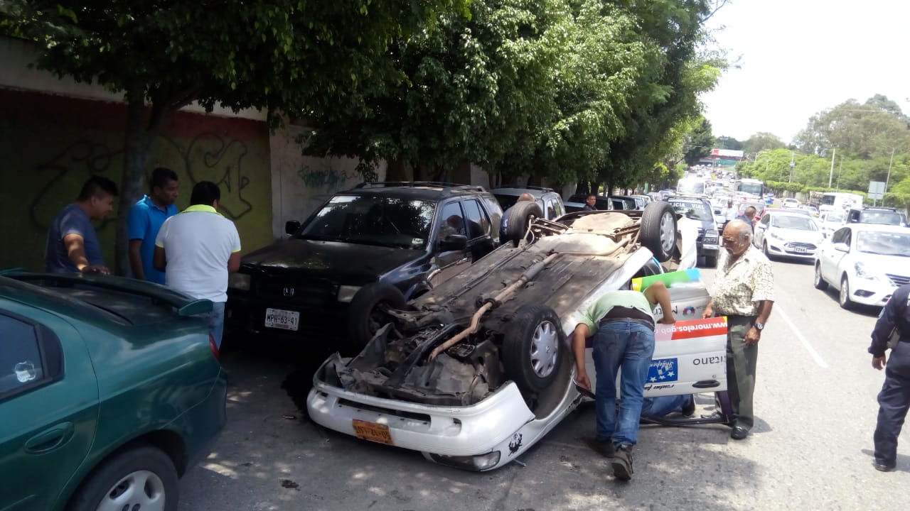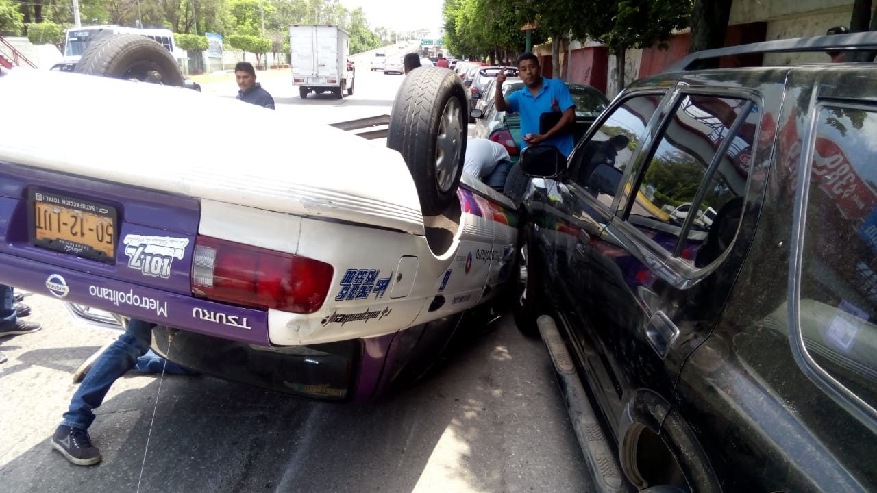 Conductor del taxi metropolitano 50-12-LUT Jesús «N» se volcó al circular presumiblemente a exceso de velocidad en la avenida Heroico Colegio Militar de Buena Vista, impactándose contra dos camionetas estacionadas.