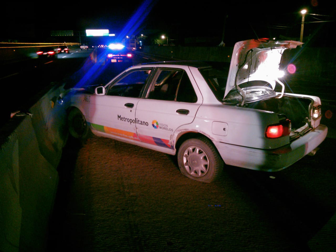 La Coordinación Estatal Morelos Estación Cuernavaca de la Policía Federal reporta que la noche de este viernes a las 23:50 fue abandonado el taxi Nissan Tsuru Metropolitano placas 24-86-LTL en el kilómetro 84 del Paso Exprés a la altura de la colonia Antonio Barona tras ser impactado contra el muro de contención.