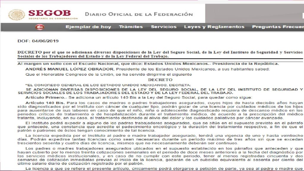 Artículo 37 Bis. Para los casos de madres o padres trabajadores asegurados, cuyos hijos de hasta dieciséis años hayan sido diagnosticados por el Instituto con cáncer de cualquier tipo, podrán gozar de una licencia por cuidados médicos de los hijos para ausentarse de sus labores en caso de que el niño, niña o adolescente diagnosticado requiera de descanso médico en los periodos críticos de tratamiento o de hospitalización durante el tratamiento médico, de acuerdo a la prescripción del médico tratante, incluyendo, en su caso, el tratamiento destinado al alivio del dolor y los cuidados paliativos por cáncer avanzado.