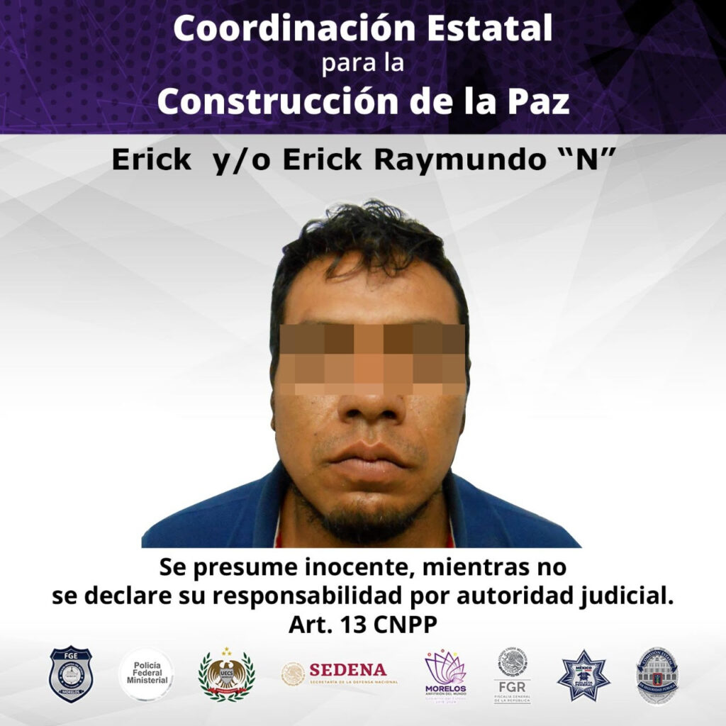 Erick y/o Erick Raymundo “N”, quedó a disposición de la autoridad judicial, quien realizó la tarde de este jueves la audiencia inicial en donde se ratifica la prisión preventiva en contra del imputado, quien enfrentará en prisión los procesos en su contra, y evitar con ello, que exista impunidad en el Estado de Morelos