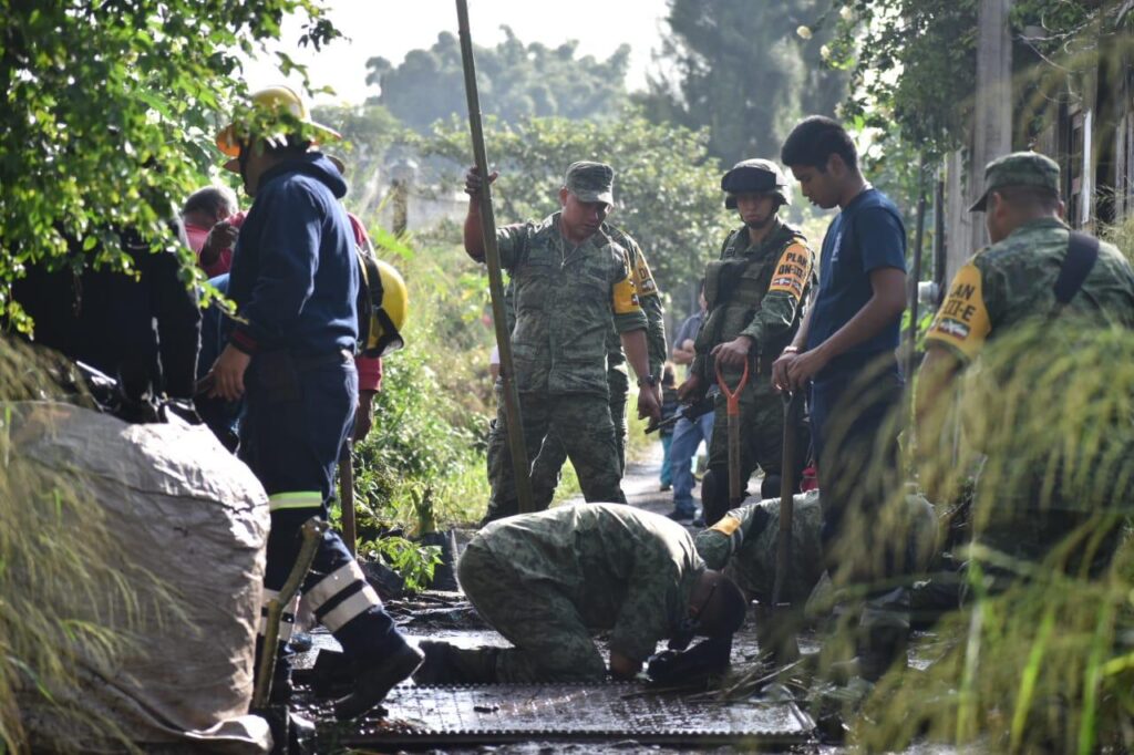 En respuesta a las afectaciones producidas por la lluvia ocurrida la noche del lunes 28 y la madrugada del martes 29 de octubre, esta mañana personal del gobierno municipal y de la secretaría de la Defensa Nacional (SEDENA) implementaron acciones de auxilio a población y comerciantes de la colonia Pinos Jiutepec que sufrieron afectaciones en sus viviendas y comercios.