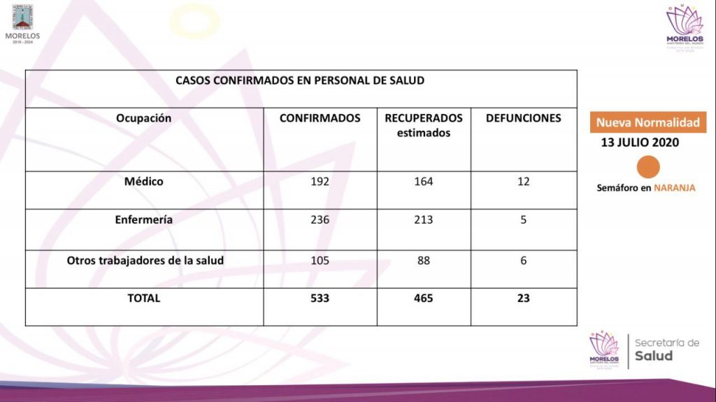 El personal de salud también se sigue contagiando al sumar ya 533 casos, de ellos 465 se reportan recuperados y 23 son lamentablemente decesos.