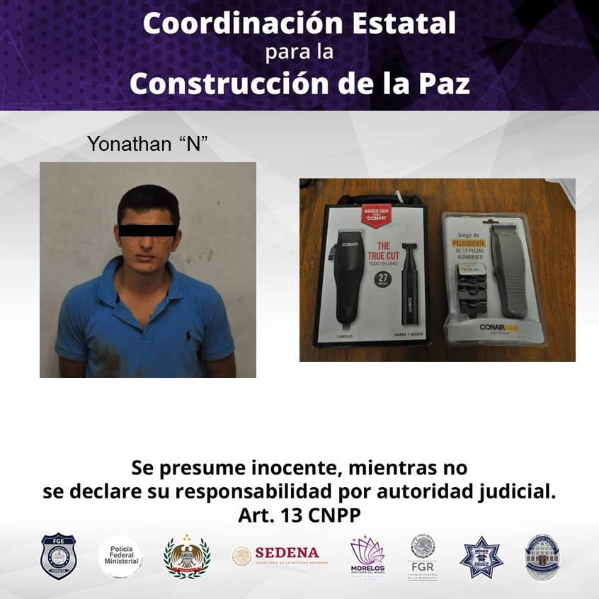 Elementos que integran el Mando Coordinado Policía Morelos detuvieron a un hombre por su presunta participación en el robo a una tienda de autoservicio, en el municipio de Yautepec.