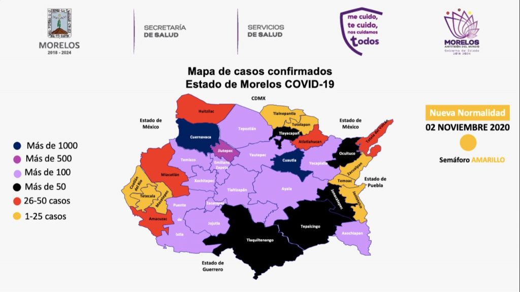 Precisó que los casos confirmados se encuentran distribuidos de la siguiente manera, Cuernavaca, mil 840; Cuautla, mil 025; Jiutepec, 708; Ayala, 307; Jojutla, 265; Temixco, 262; Yautepec, 247; Emiliano Zapata, 239; Zacatepec, 230; Xochitepec, 191; Yecapixtla, 149; Tlaltizapán, 146; Puente de Ixtla, 138; Axochiapan, 123; Tepoztlán, 104; Xoxocotla, 102; Tlaquiltenango, 95; Tlayacapan, 93; Tepalcingo, 79; Jonacatepec, 56; Ocuituco, 53; Huitzilac, 48; Atlatlahucan, 45; Amacuzac, 37; Tetela del Volcán, 34; Miacatlán, 30; Totolapan, 22; Jantetelco, 21; Temoac, 20; Tlalnepantla, 19; Mazatepec, 18; Coatlán del Río y Tetecala, 17; Zacualpan de Amilpas, 15; Coatetelco, 11; Hueyapan, 1; otros estados, 149.