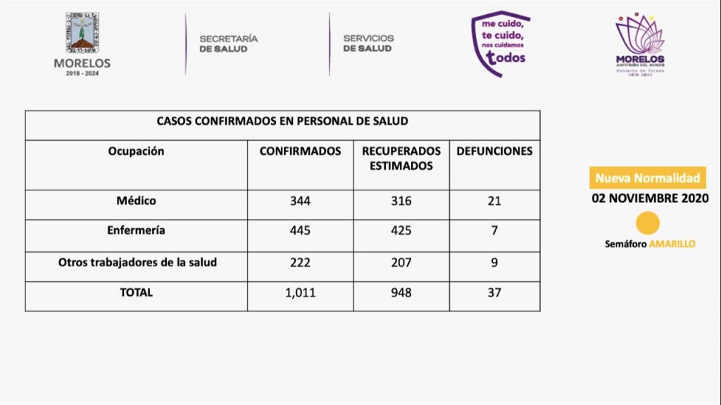 Especificó que, del total de pacientes confirmados, mil 011 son personal de salud: médicos, 344, de los cuales 316 se han recuperado y 21 han perdido la vida; enfermería, 445, con 425 que han superado la enfermedad y siete fallecimientos; otros trabajadores, 222, 207 ya sanos, con 9 decesos.