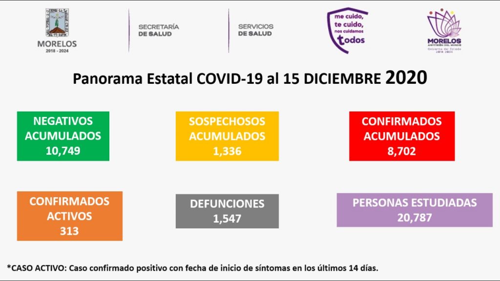 La Secretaría de Salud informa que a la fecha en Morelos se han estudiado 20 mil 787 personas, de las cuales se han confirmado ocho mil 702 con coronavirus COVID-19, 313 están activas, descartado 10 mil 749 y están como sospechosas mil 336; se han registrado mil 547 defunciones.