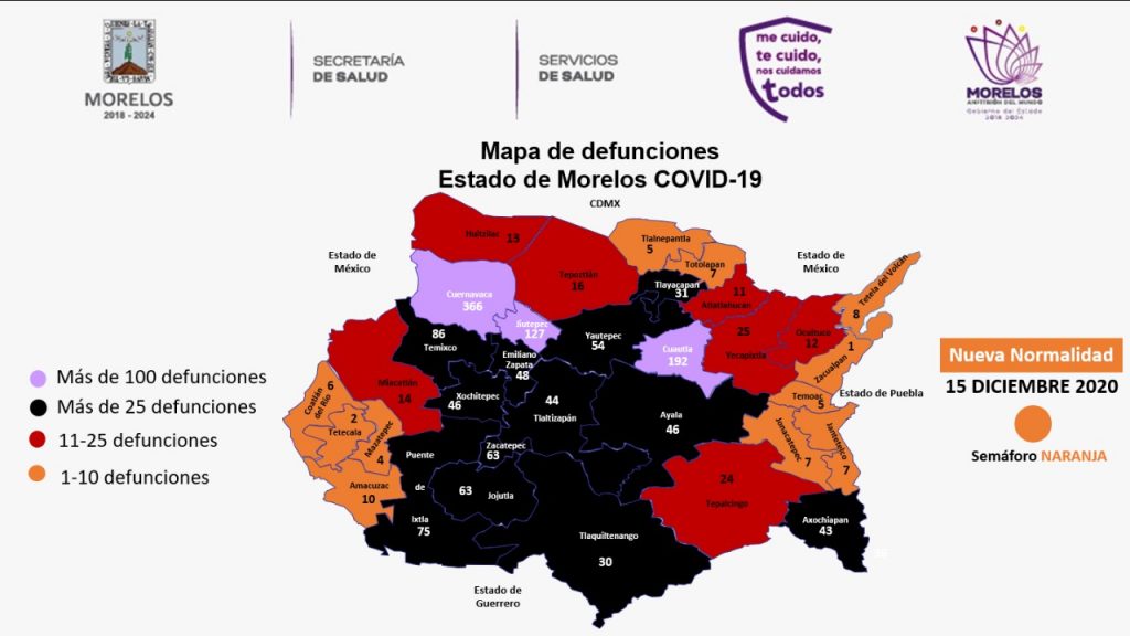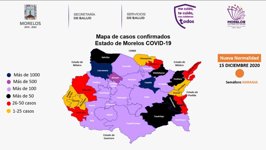 Precisó que los casos confirmados se encuentran distribuidos de la siguiente manera, Cuernavaca, dos mil 392; Cuautla, mil 206; Jiutepec, 954; Ayala y Temixco, 353; Jojutla, 339; Zacatepec, 309; Yautepec, 303; Emiliano Zapata, 291; Xochitepec, 231; Tlaltizapán, 193; Yecapixtla, 175; Puente de Ixtla, 162; Axochiapan, 131; Tepoztlán, 121; Tlaquiltenango, 117; Xoxocotla, 114; Tlayacapan, 105; Tepalcingo, 90; Ocuituco, 64; Jonacatepec, 61; Atlatlahucan, 58; Huitzilac, 56; Amacuzac, 47; Tetela del Volcán, 46; Miacatlán, 35; Jantetelco, 32; Totolapan, 26; Temoac, 24; Zacualpan de Amilpas, 23; Tlalnepantla, 21;Tetecala, 20; Coatlán del Río, 19; Mazatepec, 18; Coatetelco, 13; Hueyapan, 8; otros estados, 192.