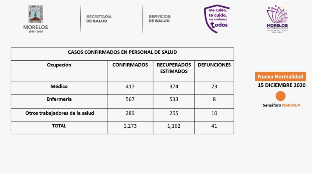 Especificó que, del total de pacientes confirmados, mil 273 son personal de salud: médicos, 417, de los cuales 374 se han recuperado y 23 han perdido la vida; enfermería, 567, con 533 que han superado la enfermedad y ocho fallecimientos; otros trabajadores, 289, 255 ya sanos, con 10 decesos.