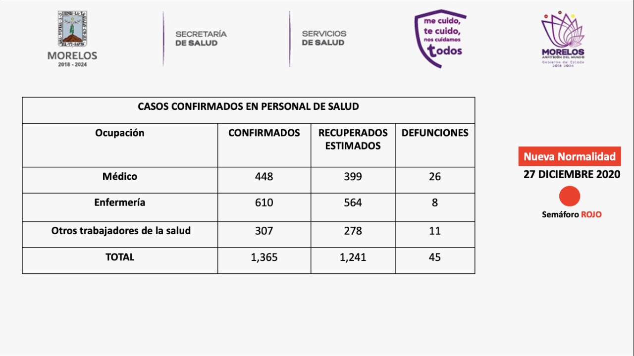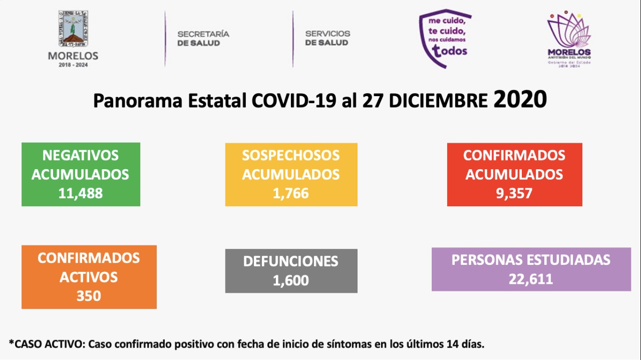 La Secretaría de Salud informa que a la fecha en Morelos se han estudiado 22 mil 611 personas, de las cuales se han confirmado nueve mil 357 con coronavirus COVID-19, 350 están activas, descartado 11 mil 488 y están como sospechosas mil 766; se han registrado mil 600 defunciones.