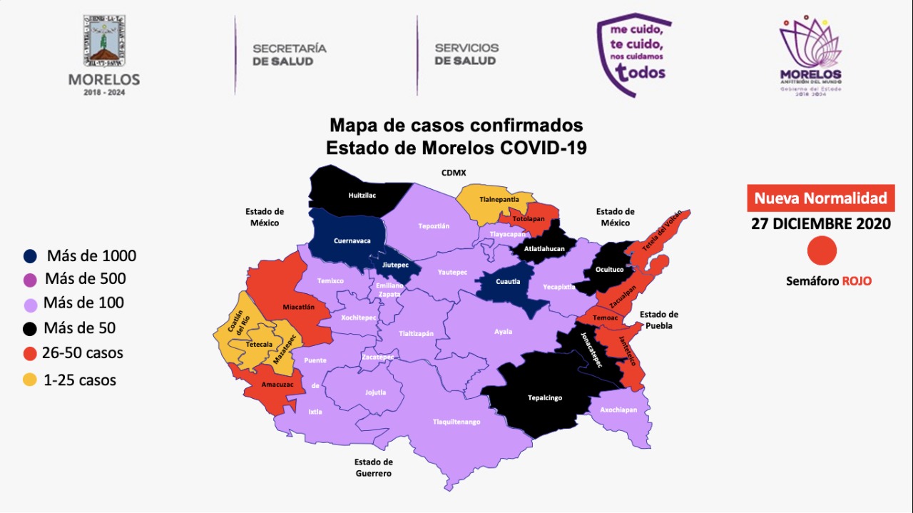 Precisó que los casos confirmados se encuentran distribuidos de la siguiente manera, Cuernavaca, dos mil 566; Cuautla, mil 292; Jiutepec, mil 029; Temixco, 383; Ayala, 373; Jojutla, 362; Zacatepec, 337; Yautepec, 330; Emiliano Zapata, 314; Xochitepec, 242; Tlaltizapán, 218; Yecapixtla, 190; Puente de Ixtla, 175; Axochiapan, 138; Tepoztlán, 133; Tlaquiltenango, 121; Xoxocotla, 118; Tlayacapan, 106; Tepalcingo, 95; Jonacatepec, 69; Ocuituco, 66; Huitzilac, 64; Atlatlahucan, 61; Amacuzac y Tetela del Volcán, 47; Jantetelco, 41; Miacatlán, 37; Totolapan, 28; Temoac, 27; Zacualpan de Amilpas, 26; Coatlán del Río, 25; Tetecala, 22; Tlalnepantla, 21; Mazatepec, 19; Coatetelco, 13; Hueyapan, 8; otros estados, 214.
