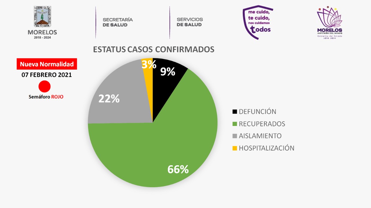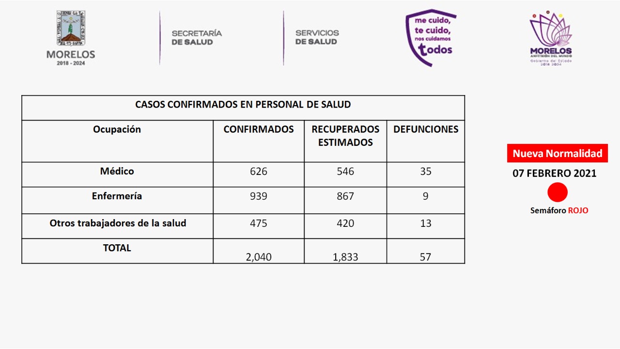 La Secretaría de Salud informa que a la fecha en Morelos se han estudiado 59 mil 957 personas, de las cuales se han confirmado 22 mil 610 con coronavirus COVID-19; 2 mil 906 están activas, descartado 35 mil 664 y están como sospechosas mil 683; se han registrado 2 mil 077 defunciones.