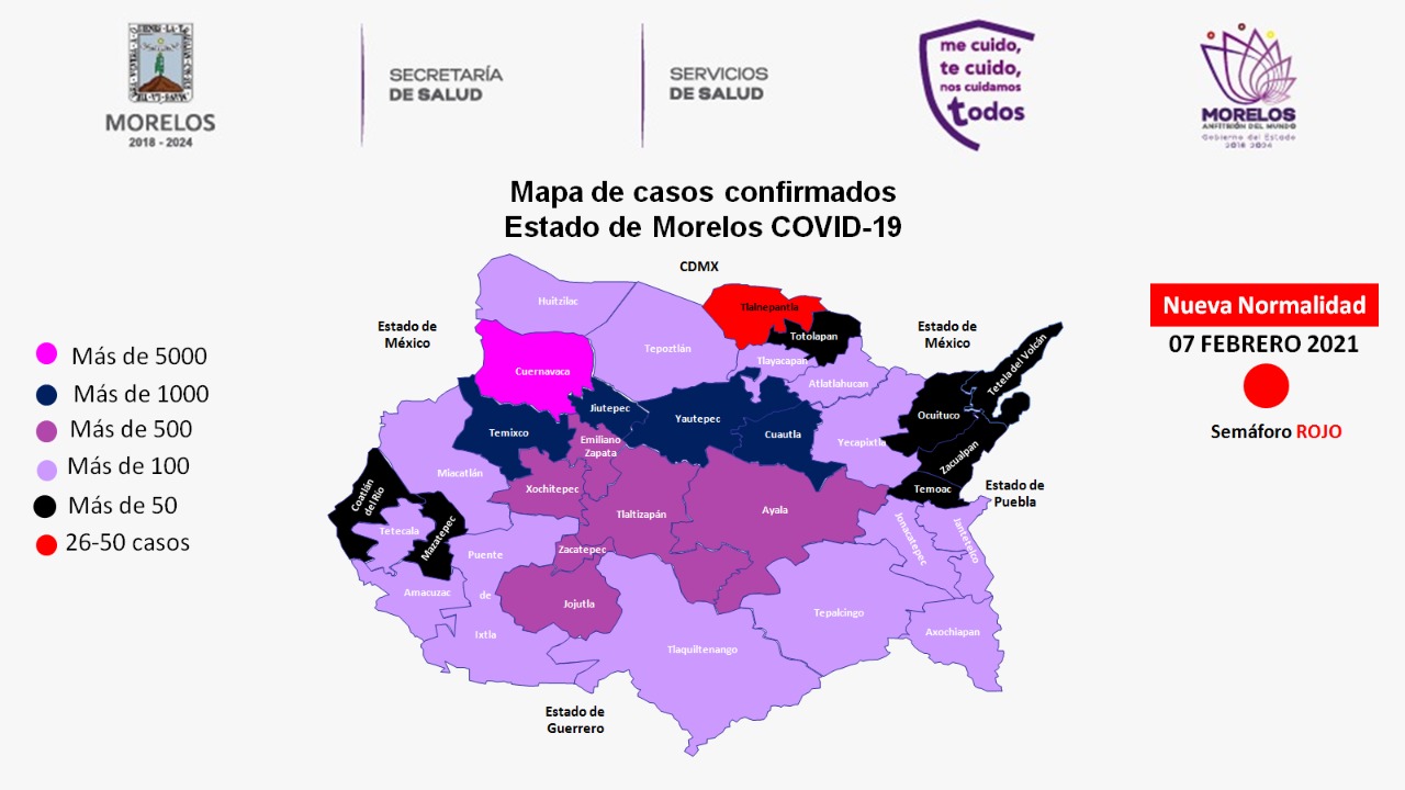 Puntualizó que los nuevos pacientes son 530 mujeres de Amacuzac, Ayala, Coatlán del Río, Cuautla, Cuernavaca, Emiliano Zapata, Huitzilac, Jantetelco, Jiutepec, Jojutla, Mazatepec, Miacatlán, Puente de Ixtla, Temixco, Tepoztlán, Tetecala, Tlaltizapán, Tlaquiltenango, Xochitepec, Yautepec, Yecapixtla, Zacatepec y Zacualpan de Amilpas, además de Azcapotzalco e Iztapalapa en la Ciudad de México y Malinalco en el Estado de México; de las cuales 522 se encuentran confinadas en sus hogares y 8 hospitalizadas reportadas como graves.