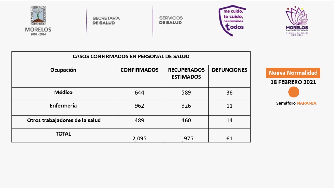 La Secretaría de Salud informa que a la fecha en Morelos se han estudiado 80 mil 113 personas, de las cuales se han confirmado 25 mil 263 con coronavirus COVID-19; mil 525 están activas, descartado 53 mil 254 y están como sospechosos mil 596; se han registrado 2 mil 211 defunciones.