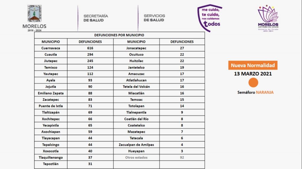 La Secretaría de Salud informó que, de acuerdo al Gobierno Federal, Morelos continuará en semáforo naranja del 15 al 28 de marzo, por lo que es fundamental fortalecer las medidas sanitarias en todo momento; así como, respetar las actividades económicas y sociales establecidas en el semáforo de riesgo COVID-19.