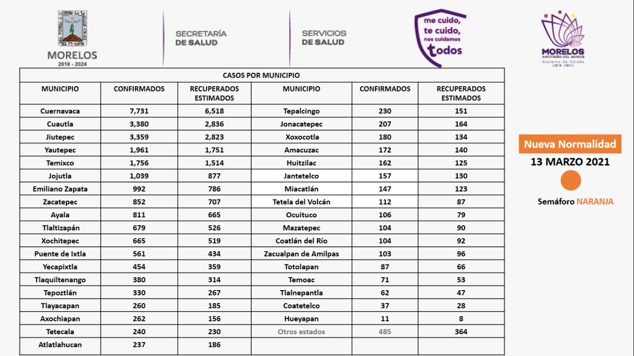 La Secretaría de Salud informó que, de acuerdo al Gobierno Federal, Morelos continuará en semáforo naranja del 15 al 28 de marzo, por lo que es fundamental fortalecer las medidas sanitarias en todo momento; así como, respetar las actividades económicas y sociales establecidas en el semáforo de riesgo COVID-19.
