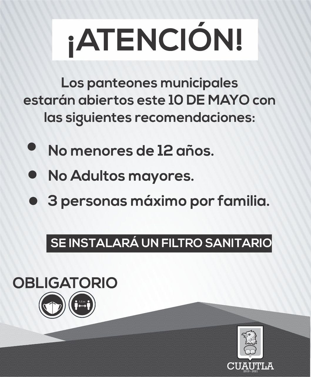 El Gobierno Municipal de Cuautla, a través de la Secretaría del Ayuntamiento, informa que el histórico panteón municipal de Cuautla y los panteones comunitarios del municipio permanecerán abiertos este lunes 10 de mayo cumpliendo las medidas sanitarias como son el uso de cubre bocas obligatorio y guardar un metro y medio de sana distancia, informó el secretario municipal, José Alfredo Escalona Arias.