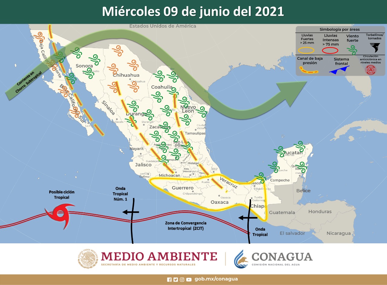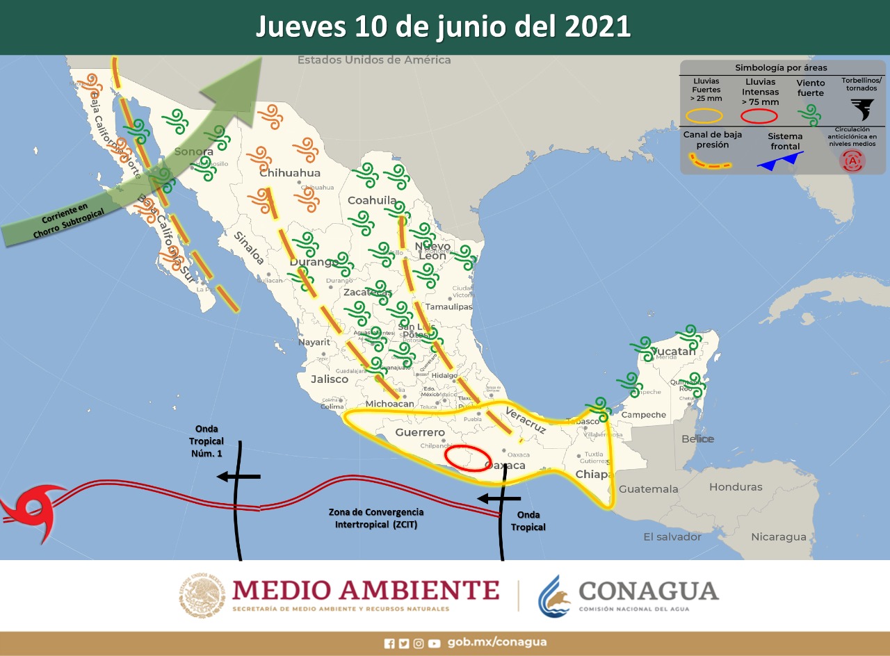 Se registra una disminución en las condiciones de inestabilidad atmosférica en la mayoría del territorio nacional, exceptuando el sur y sureste del país, donde aún se espera la presencia de tormentas dispersas, se presentarán condiciones variables, con cielo medio nublado en general.