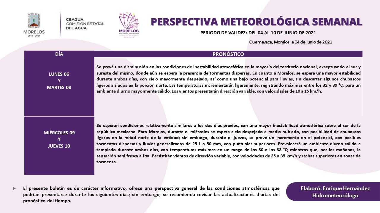 Por lo anterior, sobre el estado de Morelos se prevé un incremento en la inestabilidad atmosférica, con cielo medio nublado a nublado y potencial para la ocurrencia de tormentas y lluvias con acumulados máximos de 25.1 a 50 mm, de forma generalizada.
