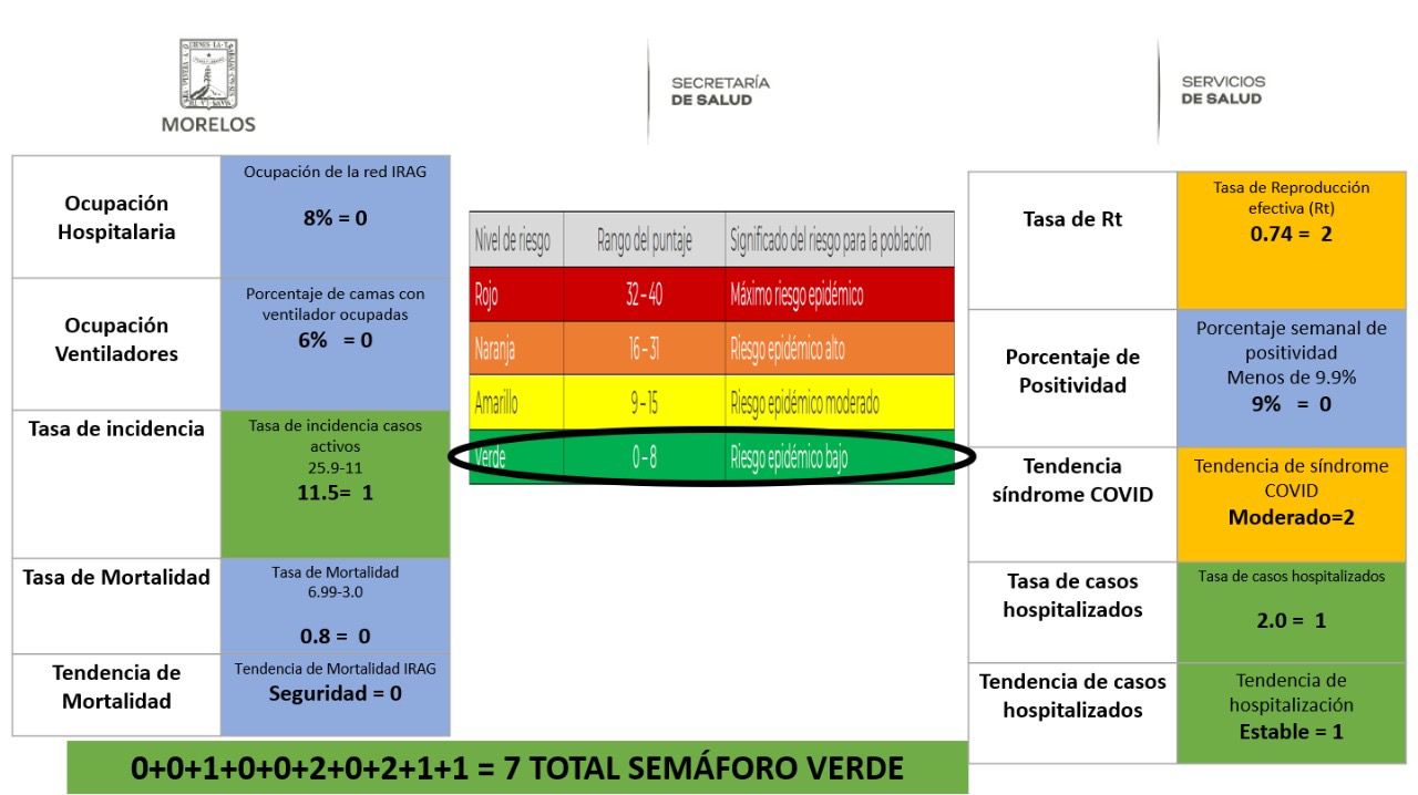 La Secretaría de Salud federal informó que Morelos continúa en color verde de acuerdo al semáforo de riesgo epidémico, en tanto, conminó a la población a generar una cultura del autocuidado y priorizar la salud.