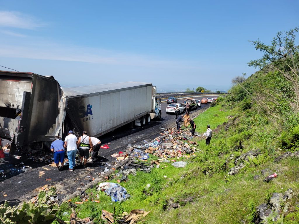 Por el sobrecalentamiento de las balatas, un tráiler se incendió en la autopista México-Cuernavaca, a la altura de la Pera del municipio de Tepoztlán.