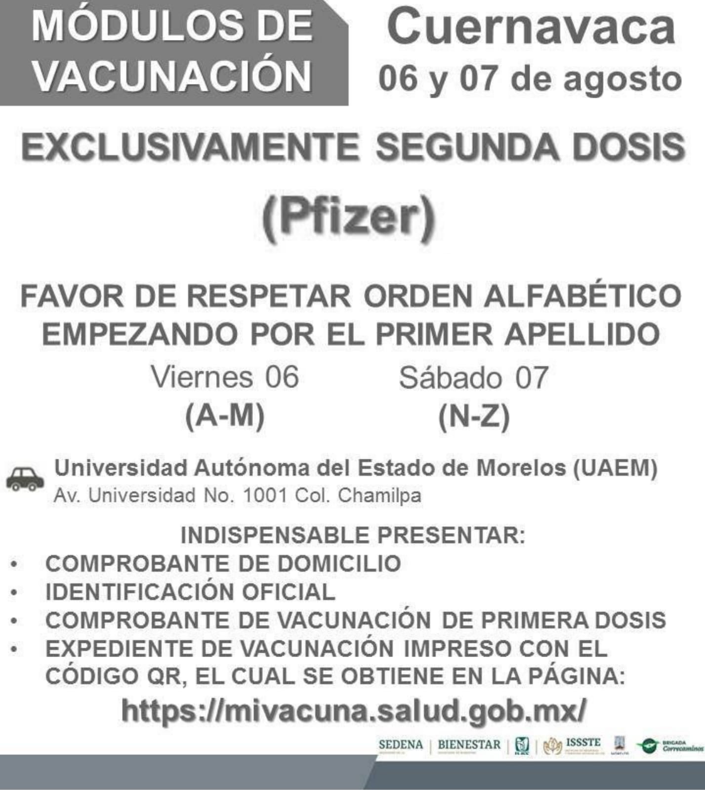 La Brigada Correcaminos en Morelos informa que está lista en la ciudad de Cuernavaca una Jornada especial para la aplicación de segundas dosis de vacuna Pfizer contra COVID-19 este viernes 6, sábado 7 y domingo 8 de agosto.
