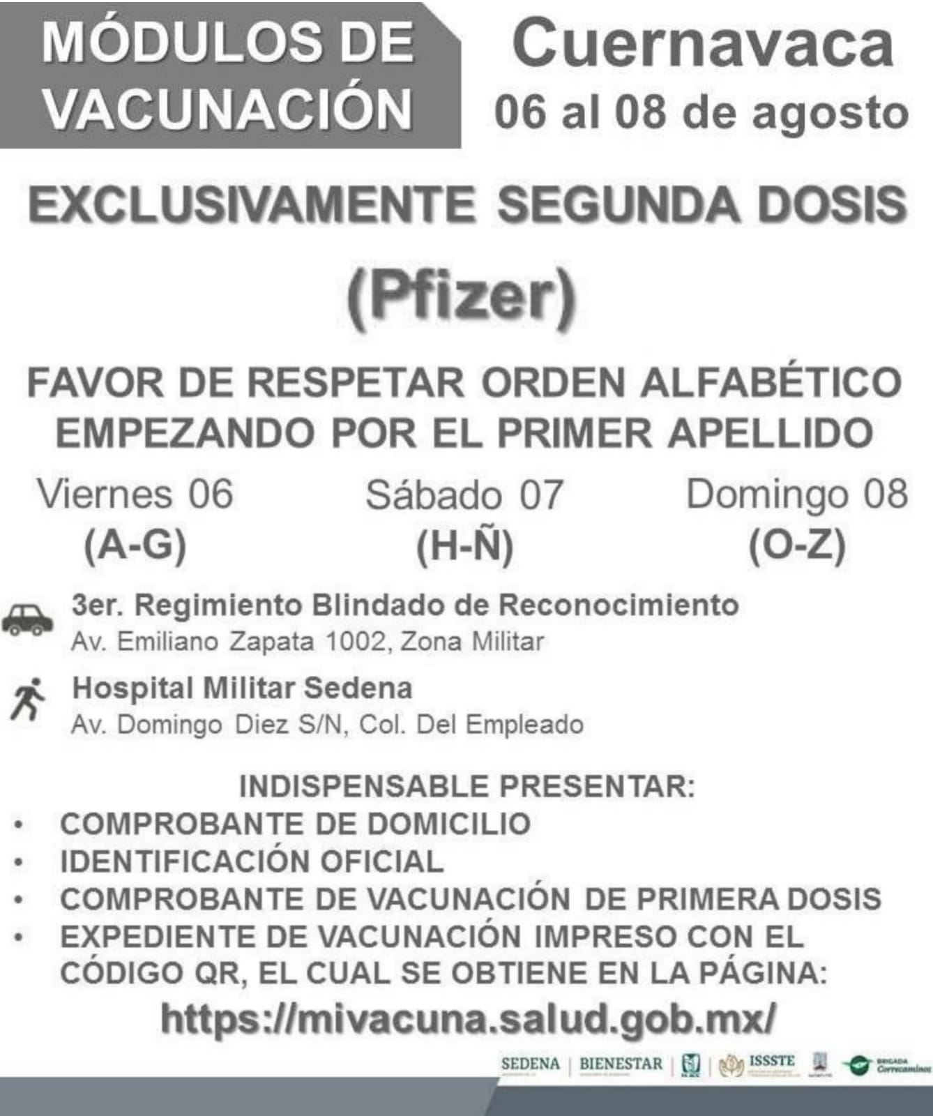 Con el objetivo de hacer más expedito el proceso de aplicación de las segundas dosis de la vacuna contra COVID-19 en el Tercer Regimiento Blindado de Reconocimiento (Vehicular) y en el Hospital Militar SEDENA en la ciudad de Cuernavaca (peatonal) se deberá asistir por orden alfabético de acuerdo a la primera letra de su apellido paterno: