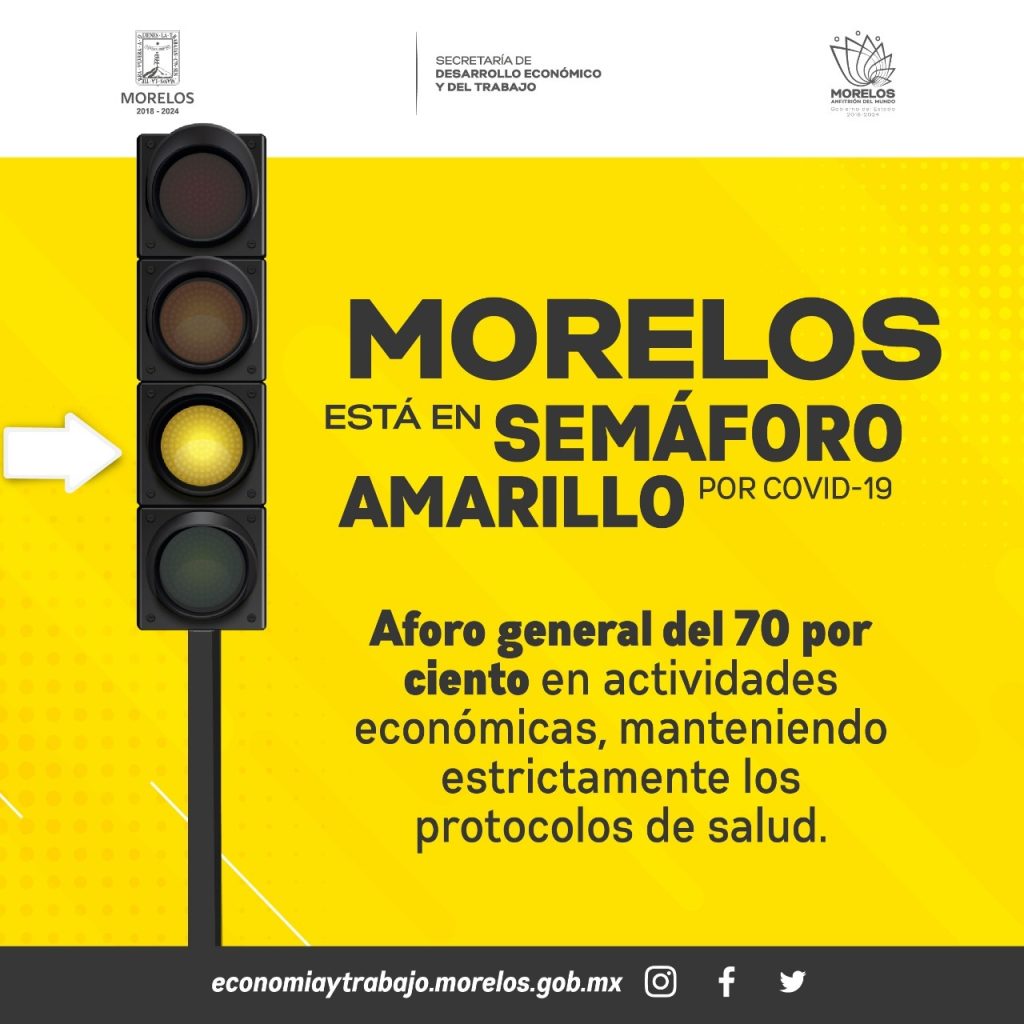 Tras el anuncio de las autoridades federales y estatales en materia de salud, respecto al cambio en el semáforo de riesgo por COVID-19 a color amarillo en Morelos, la titular de la Secretaría de Desarrollo Económico y del Trabajo (SDEyT), Ana Cecilia Rodríguez González, informa puntualmente las actividades económicas a desempeñarse y su aforo en esta etapa de reapertura.