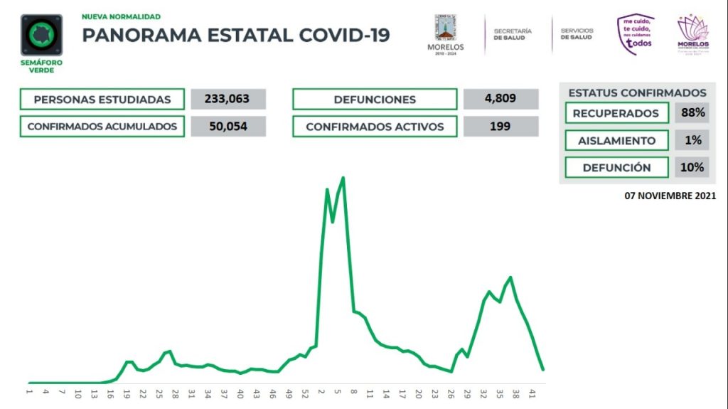 La Secretaría de Salud informa que a la fecha en Morelos se han estudiado 233 mil 063 personas, de las cuales se han confirmado 50 mil 054 con coronavirus COVID-19; 199 están activas y se han registrado 4 mil 809 defunciones.