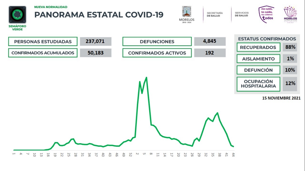 La Secretaría de Salud informa que a la fecha en Morelos se han estudiado 237 mil 071 personas, de las cuales se han confirmado 50 mil 183 con coronavirus COVID-19; 192 están activas y se han registrado 4 mil 845 defunciones.