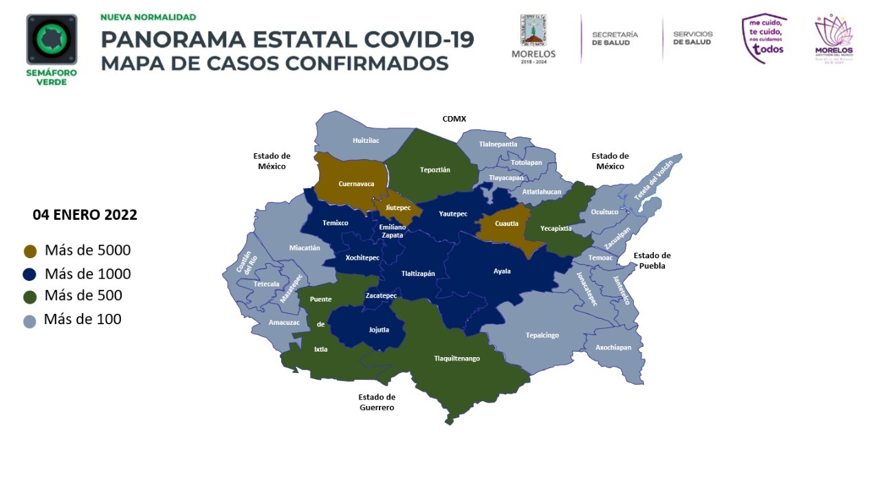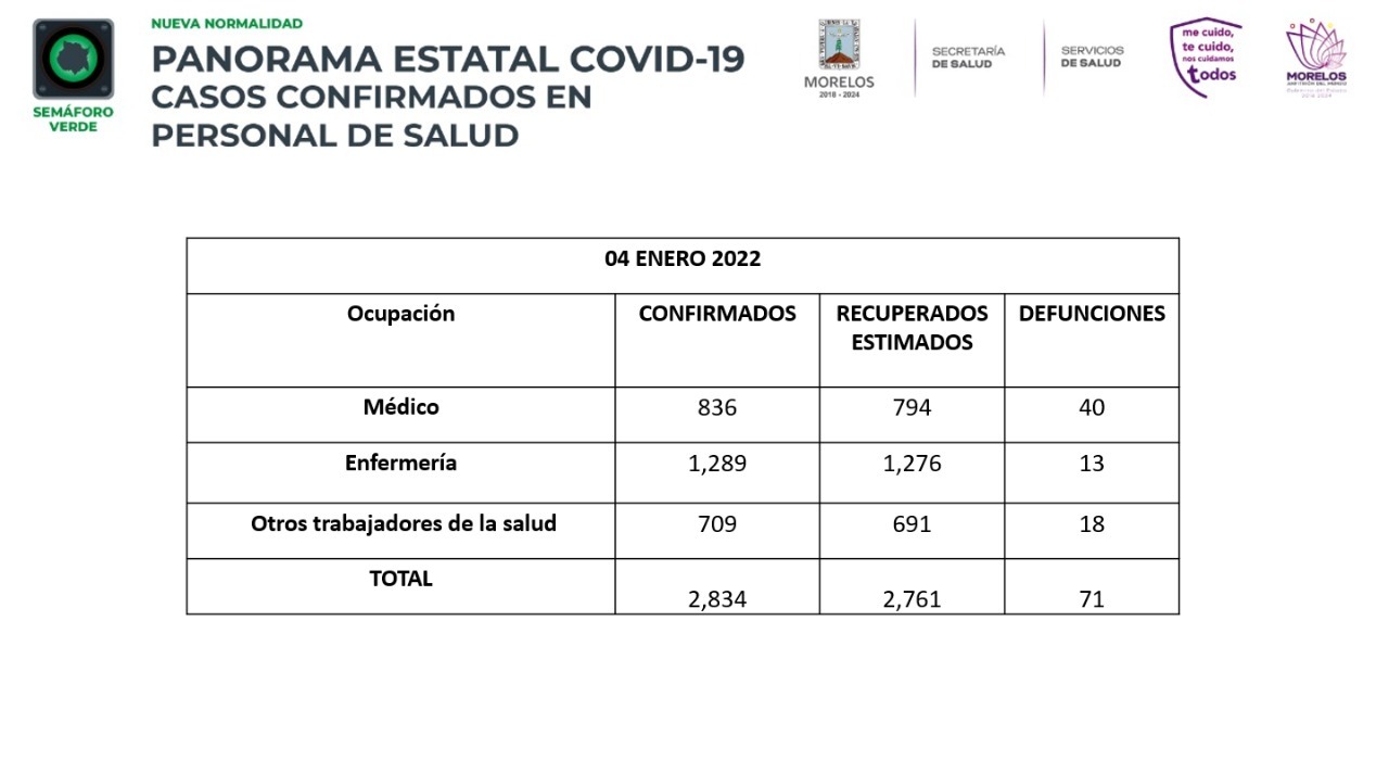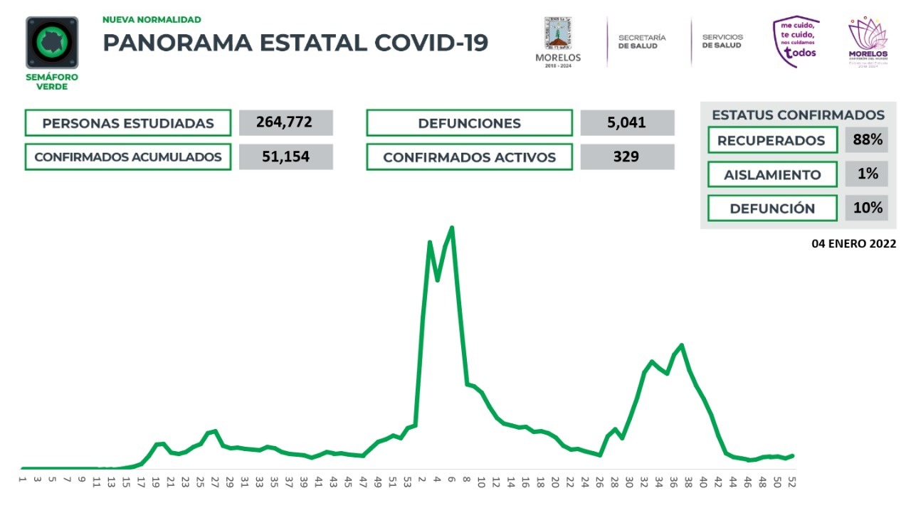 La Secretaría de Salud informa que a la fecha en Morelos se han estudiado 264 mil 772 personas, de las cuales se han confirmado 51 mil 154 con coronavirus COVID-19; 329 están activas y se han registrado 5 mil 041 defunciones.