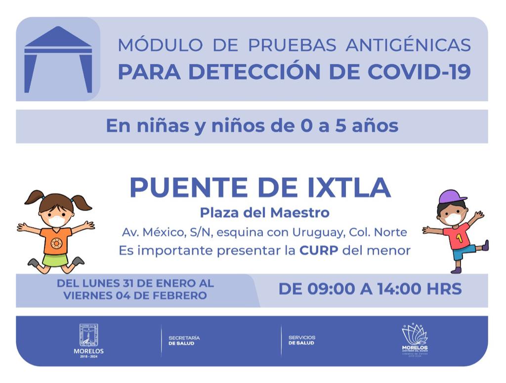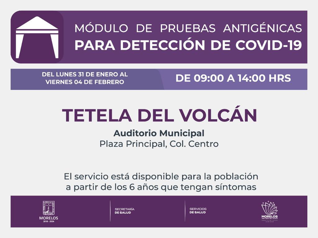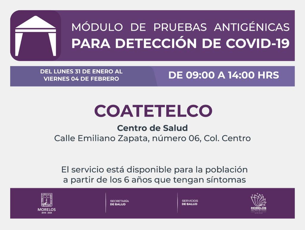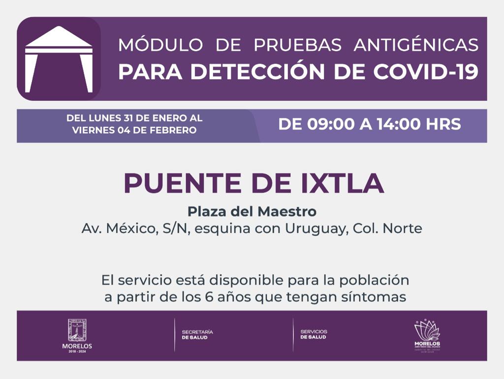 Del lunes 31 de enero al viernes 04 de febrero, la Secretaría de Salud y Servicios de Salud de Morelos (SSM) llevarán los módulos de pruebas antigénicas para la detección de COVID-19 a los municipios de Tetela del Volcán, Coatetelco y Puente de Ixtla.