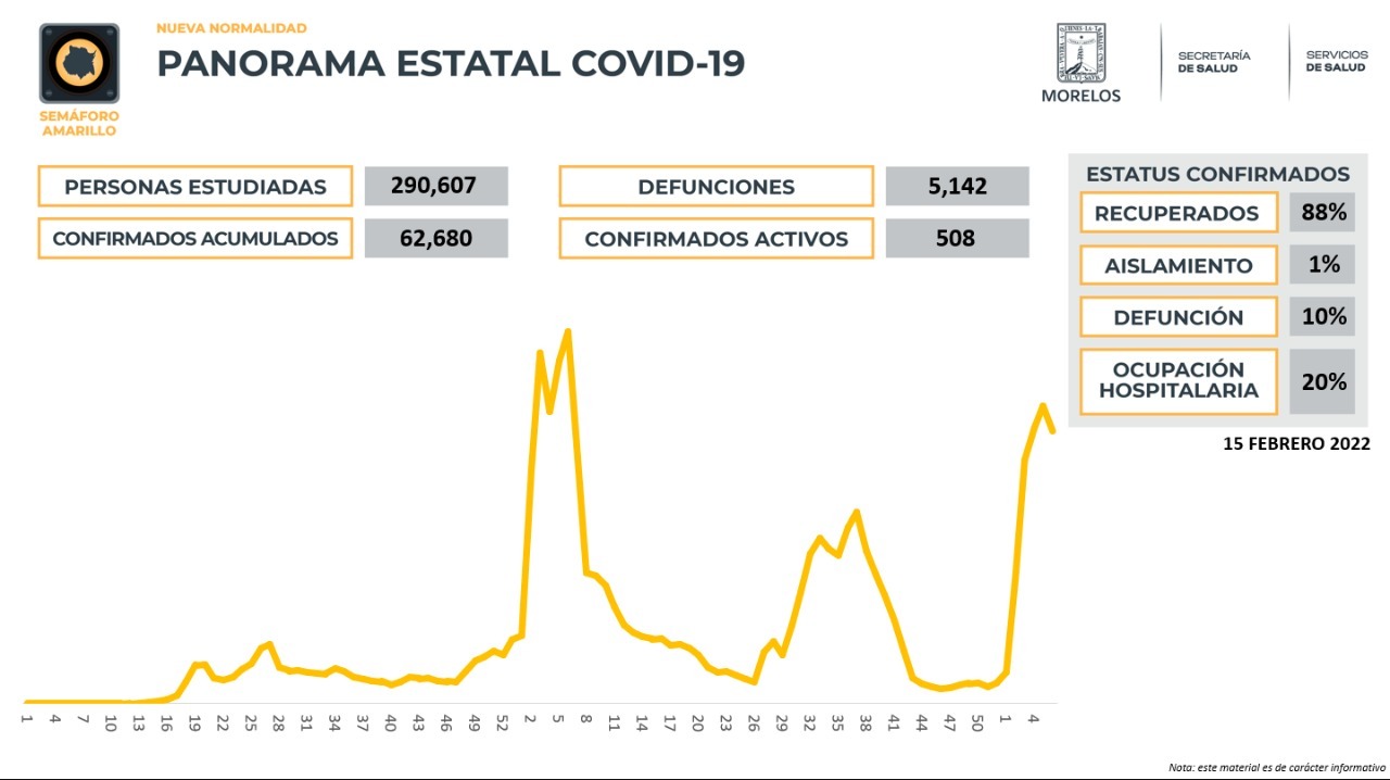 La Secretaría de Salud informa que a la fecha en Morelos se han estudiado 290 mil 607 personas, de las cuales se han confirmado 62 mil 680 con coronavirus COVID-19; 508 están activas y se han registrado 5 mil 142 defunciones.