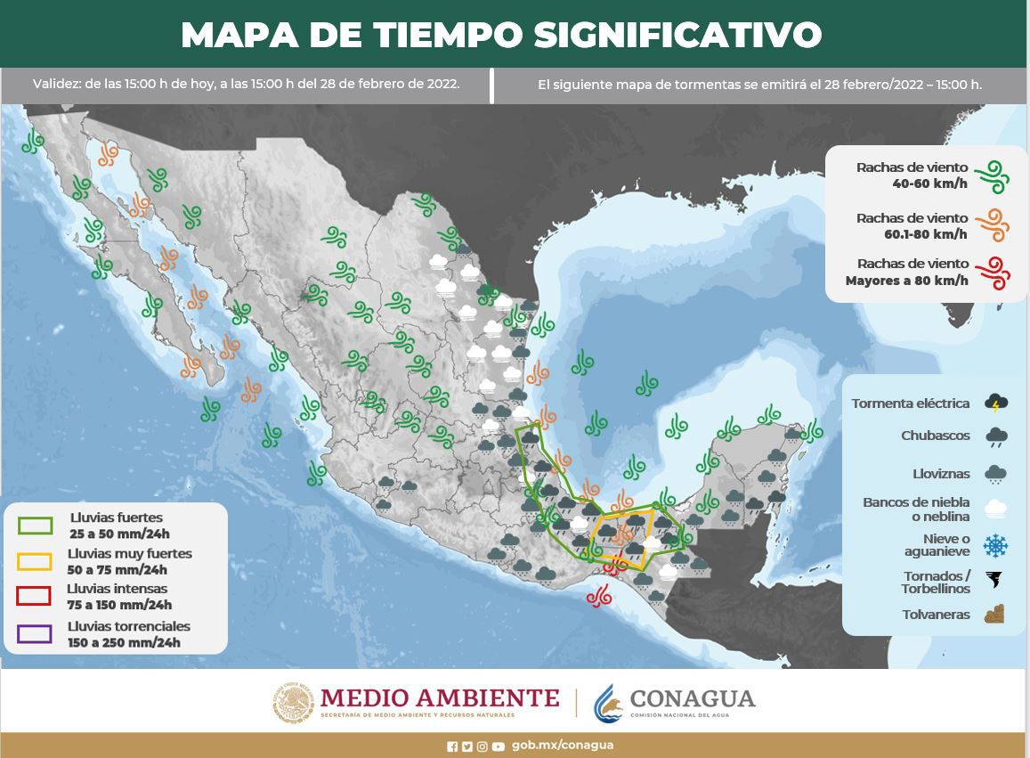 El ambiente vespertino será cálido, con temperaturas máximas de hasta 38°C; aunque por las madrugadas y mañanas, la sensación será fría, con mínimas que no rebasarán los 15°C, menores a 5°C en localidades de montaña. Los vientos no presentarán una dirección dominante, manteniendo velocidades de 10 a 20 km/h.