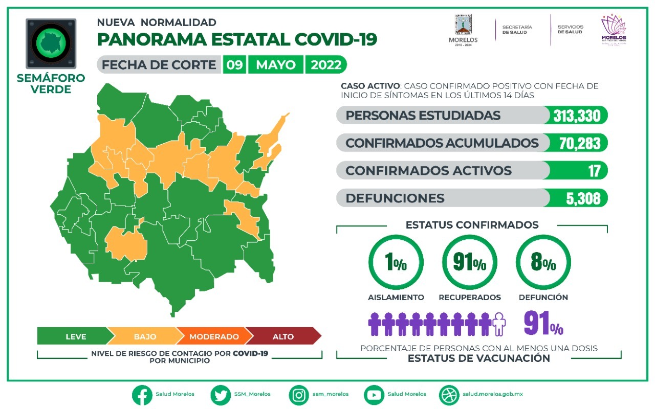 La Secretaría de Salud informa que a la fecha en Morelos se han estudiado 313 mil 330 personas, de las cuales se han confirmado 70 mil 283 con coronavirus COVID-19; 17 están activas y se han registrado 5 mil 308 defunciones.
