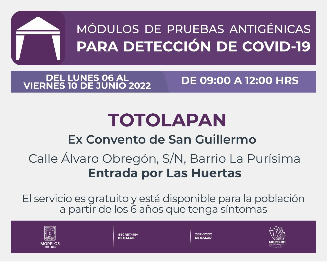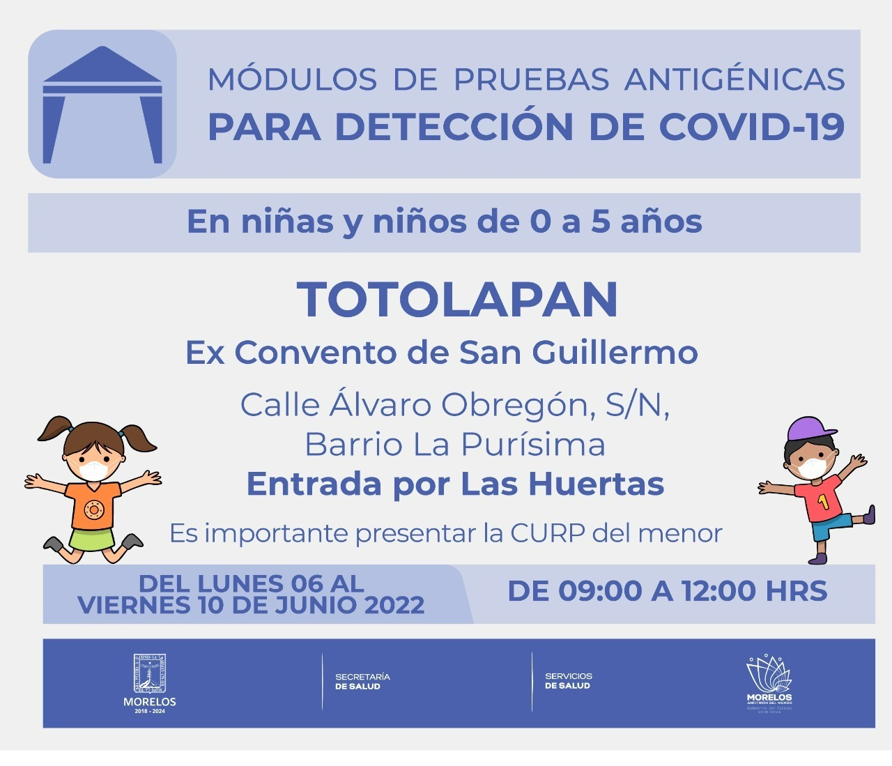 Con el objetivo de mantener la detección oportuna de casos positivos a COVID-19, el Gobierno estatal, a través de la Secretaría de Salud y Servicios de Salud de Morelos (SSM), informó que instalarán el módulo de pruebas antigénicas para adultos y menores de edad en el municipio de Totolapan.