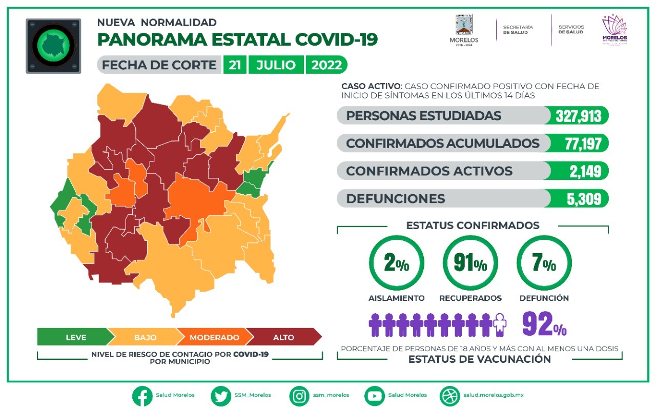 La Secretaría de Salud informa que a la fecha en Morelos se han estudiado 327 mil 913 personas, de las cuales se han confirmado 77 mil 197 con coronavirus COVID-19; 2 mil 149 están activas y se han registrado 5 mil 309 defunciones.