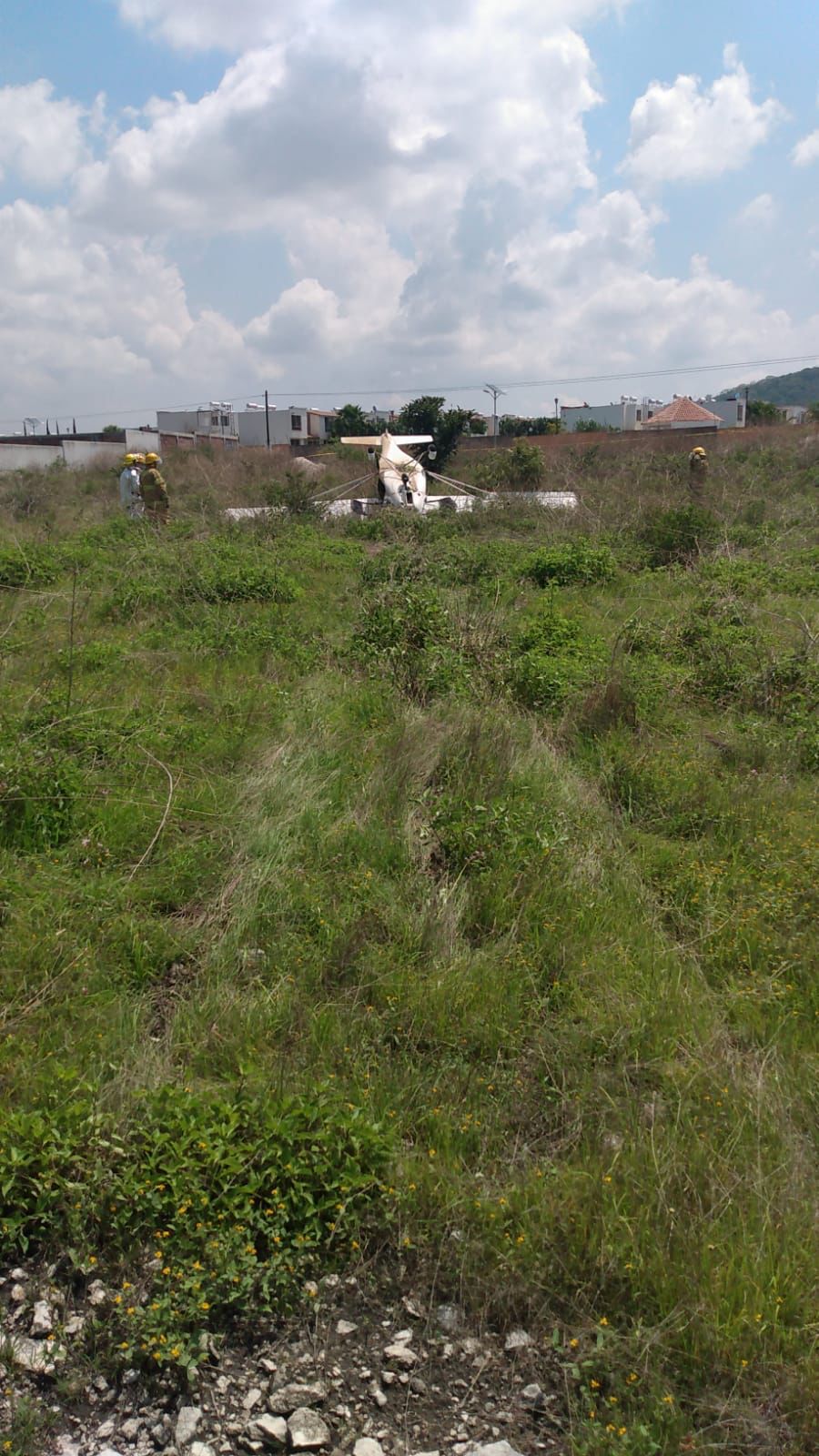 A las 12:16 del medio día se desplomó una avioneta Cessna sobre un terreno del Fraccionamiento Santa Fe municipio de Xochitepec, se reporta al piloto lesionado en segundo grado.