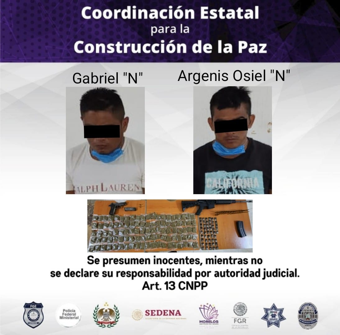 Elementos que integran la Estrategia de Seguridad Mando Coordinado Policía Morelos detuvieron a dos hombres por su presunta responsabilidad en delitos contra la Salud y violación a la Ley Federal de Armas de Fuego y Explosivos, en el municipio de Temixco.