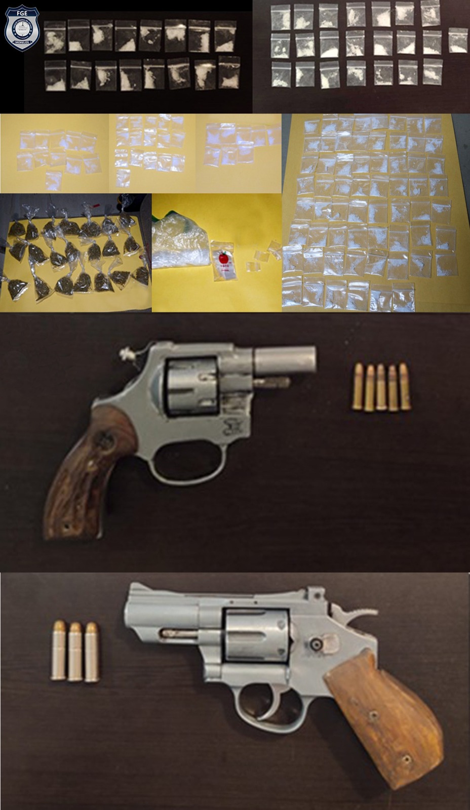 A Germán “N” se le aseguró un arma de fuego tipo revólver abastecida con tres cartuchos útiles y 22 dosis de la droga conocida como «cristal», mientras que a Eduardo “N” se le decomisó un arma de fuego tipo revólver abastecida con cinco cartuchos, así como 16 dosis de la metanfetamina.