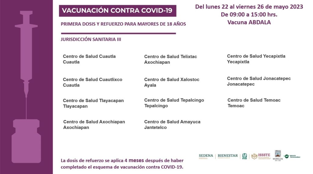 El Gobierno estatal convocó a la población de 18 años y más a acudir a los centros de salud que cuentan con biológico Abdala, para inmunizarse contra COVID-19, del lunes 22 al viernes 26 de mayo de 2023, en un horario de 09:00 a 15:00 horas.