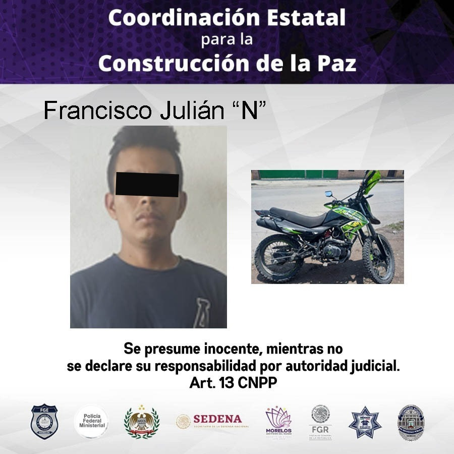 La tarde del domingo, elementos del Mando Coordinado Policía Morelos detuvieron a un hombre por su presunta responsabilidad en el delito de posesión de una motocicleta de procedencia ilícita y/o lo que resulte, en el municipio de Jiutepec.