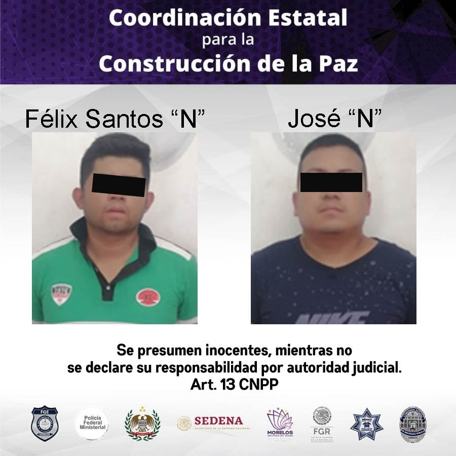 Mediante el señalamiento directo y su deseo de proceder legalmente en su contra, detuvieron a Félix Santos “N” y José “N”, ambos de 31 años de edad, a quienes después de indicarles sus derechos de ley, fueron puestos a disposición del agente del Ministerio Público para que determine su situación jurídica.