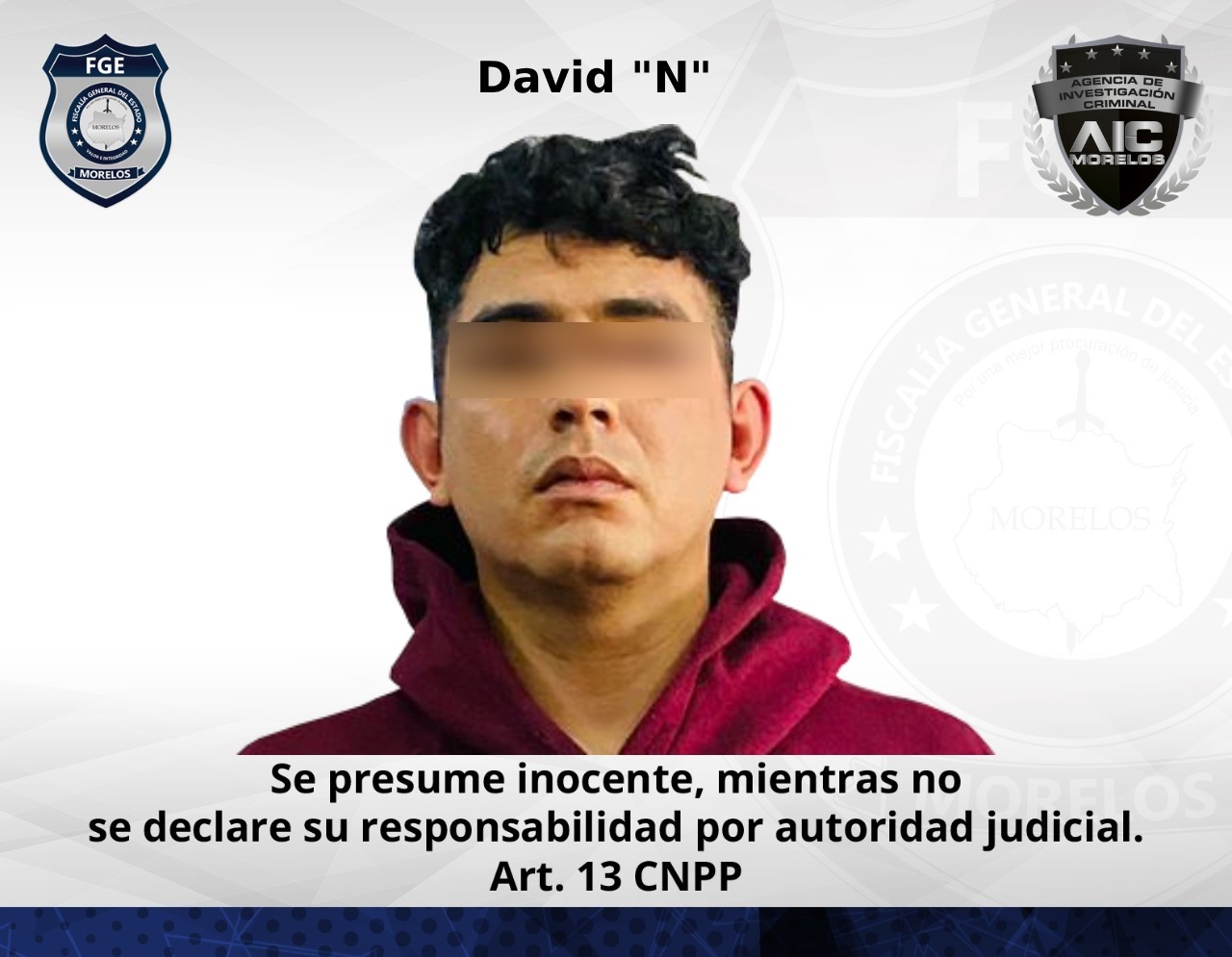 David “N” alias “El Chino” de 29 años de edad, enfrenta además proceso por robo de vehículo con violencia cometido el 13 de septiembre de la presente anualidad, cuando en compañía de Rodrigo Aramis “N” despojaron a una mujer de una camioneta marca Jeep, tipo Patriot, color rojo, modelo 2014, en la carretera Galeana-Tequesquitengo, en la comunidad de El Jicarero, perteneciente a Jojutla.