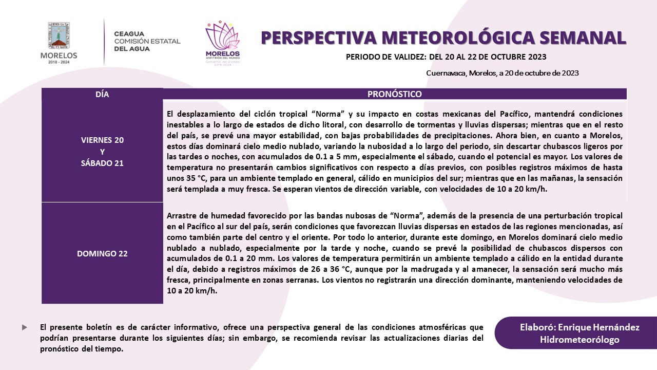 Específicamente para el estado de Morelos, durante el sábado prevalecerán nublados dispersos a lo largo del día, con posibles chubascos vespertinos a nocturnos dispersos de 0.1 a 15 mm. El ambiente durante el día será cálido a templado, debido a temperaturas máximas de 25 a 35 °C, refrescando hacia la noche y madrugada, con una sensación más fresca por la mañana. Dominarán vientos de diferentes direcciones, con velocidades de 10 a 20 k/h.