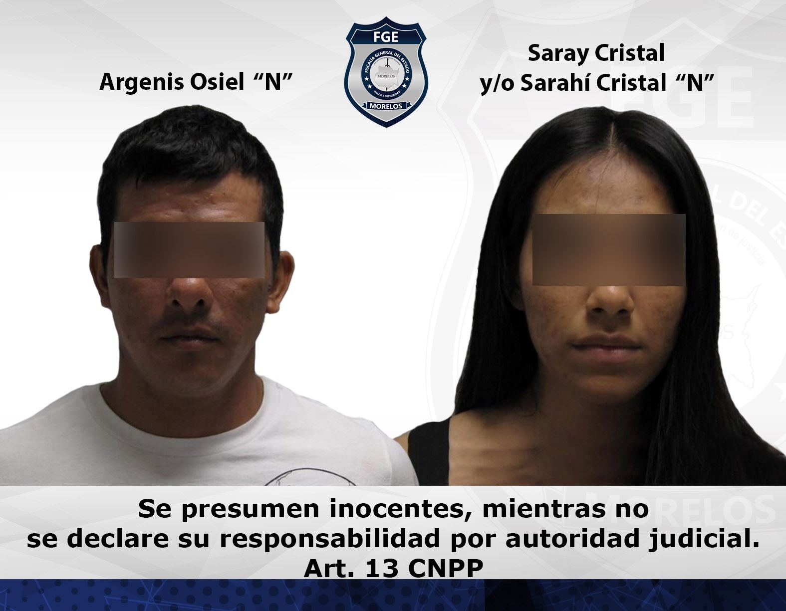 Por su presunta responsabilidad en delitos contra la salud en su modalidad de narcomenudeo, por posesión de marihuana con fines de comercio, la Fiscalía Metropolitana obtuvo la vinculación y prisión preventiva en contra de Argenis Oziel “N” y Saray Cristal y/o Sarahí Cristal “N”, quienes fueron detenidos a bordo de un vehículo tipo taxi en el municipio de Temixco.