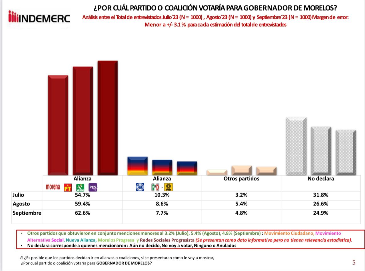 El estudio demoscópico, realizado entre el 24 y 27 de septiembre en toda la entidad, que consistió en la aplicación de 1,000 entrevistas domiciliarias a mayores de 18 años con credencial del INE vigente, con un 95% de confianza y margen de error de +/- 3.1%, reveló además que la intención de voto para gobernador para una alianza de Morena-PT-Partido Verde-PES aumentó, al pasar de 59.4% en agosto a 62.6%, en tanto que los partidos que conformarían el Frente Amplio por México, PAN-PRI-PRD solo registran un 7.7%, lo que indica que su preferencia continúa a la baja, ya que en julio registraba 10.3% y agosto un 8.6%.