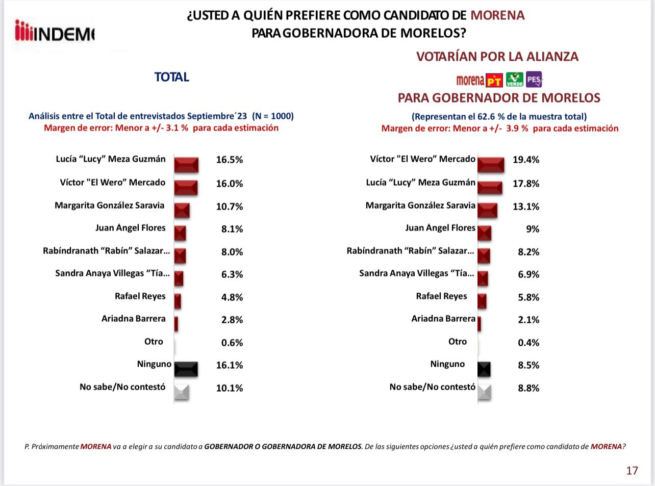 • _El más reciente estudio demoscópico de la casa encuestadora, realizado entre el 24 y 27 de septiembre, ubicó a Víctor “El Wero” Mercado con un 19.4% de las preferencias como candidato de Morena a Gobernador por 17.8% de la Senadora Lucía “Lucy” Meza, entre simpatizantes de una alianza de los partidos Morena-PT-Partido Verde-PES, rebasando a los demás aspirantes hasta por dos dígitos._