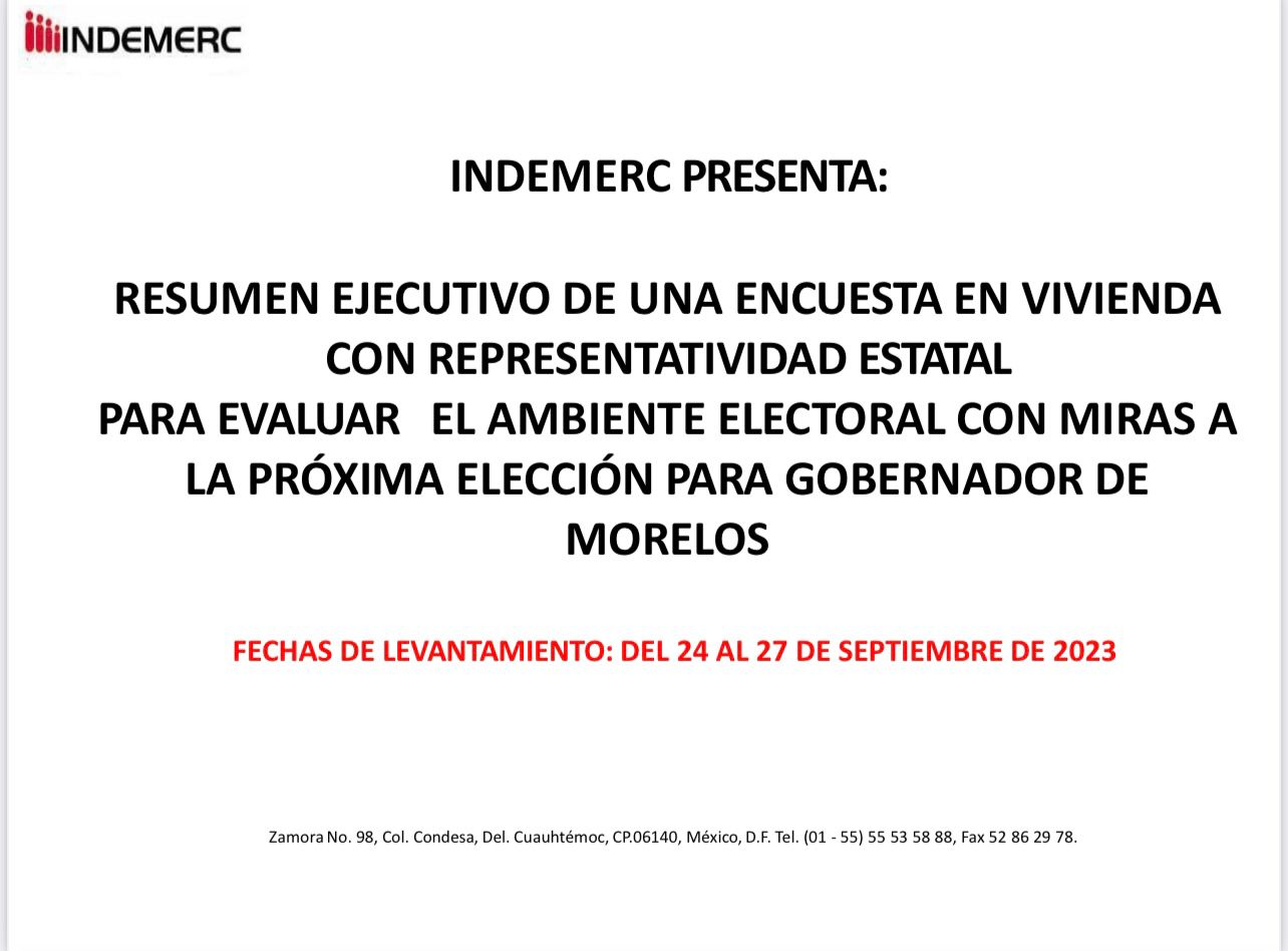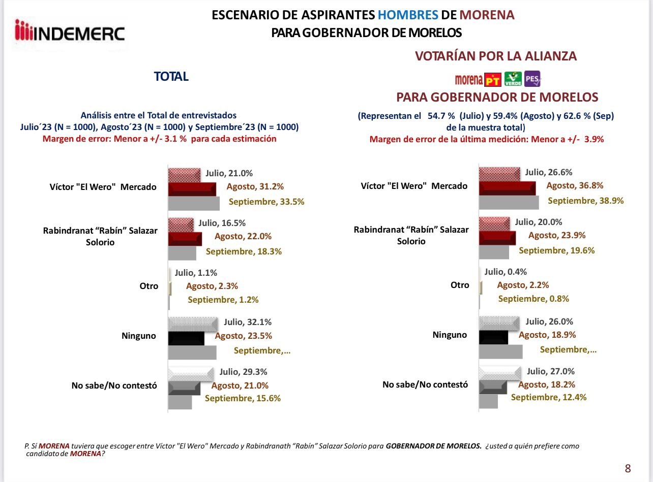*Ciudad de México a 3 de octubre de 2023*.- En su medición de finales de septiembre en Morelos, la encuestadora Indemerc Harris Interactive (Indemerc) reveló que el Coordinador de Asesores de la Oficina de la Gubernatura, Víctor “El Wero” Mercado, se ubica al frente de los aspirantes morenistas a la candidatura a Gobernador registrando un 19.4% entre simpatizantes de una alianza de los partidos Morena-PT-Partido Verde-PES, superando a la Senadora Lucía “Lucy” Meza (17.8%), así como a Margarita González Saravia (13.1%); al Presidente Municipal de Jojutla, Juan Ángel Flores (9.0%); a Rabindranath Salazar (8.2%); a la Secretaria de Administración del gobierno estatal, Sandra Anaya (6.9%); al Presidente Municipal de Jiutepec, Rafael Reyes (5,8%); y a la diputada local Ariadna Barrera (2.1%).