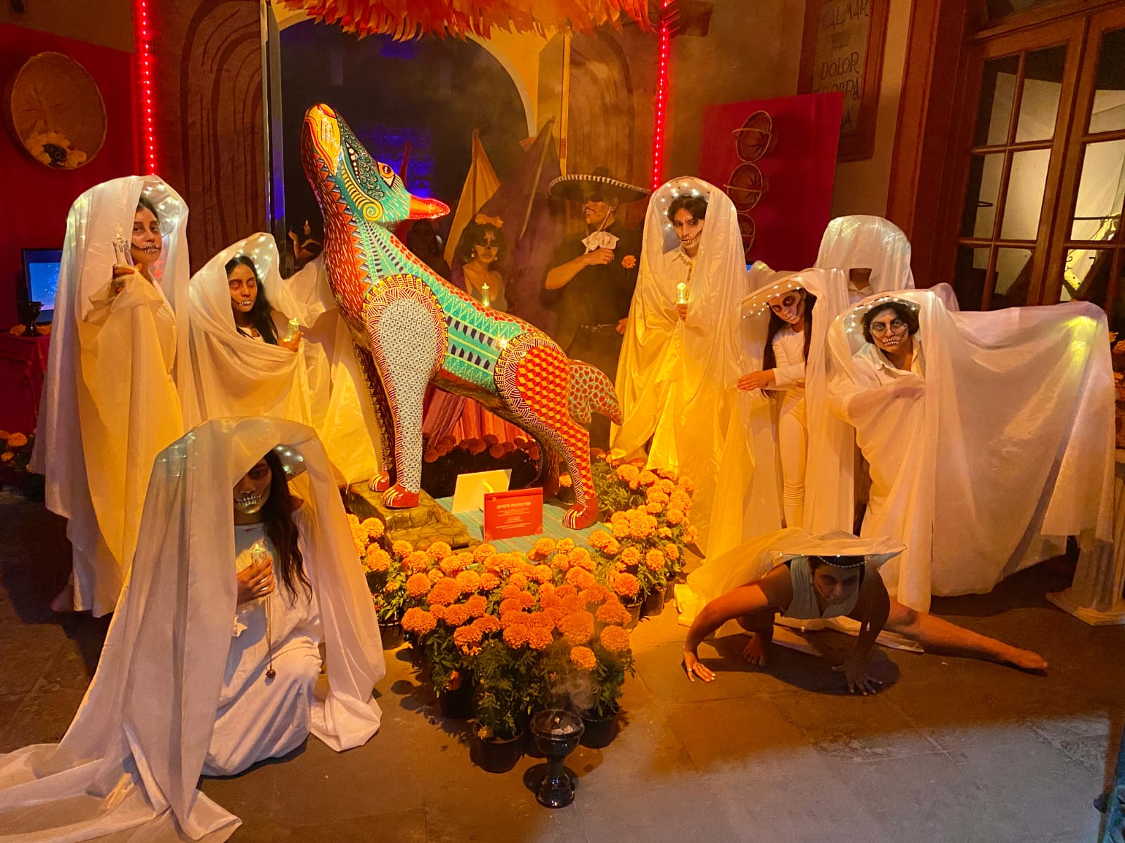 Todo ello impreso en gran formato y colocado en el vestíbulo, patio y escenario principal, generando una ambientación alusiva y representativa del Día de Muertos, además de las esculturas monumentales, realizadas por la destacada artesana y maestra Belén Sánchez.